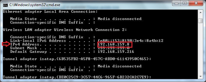 - Em seguida, na tela preta, digite ‘IPCONFIG’ e pressione Enter para ver informações na sua conexão ativa