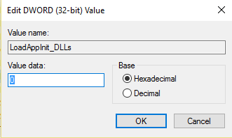 • E clique duas vezes em LoadAppInit_DLLs> altere o valor de 1 para 0.