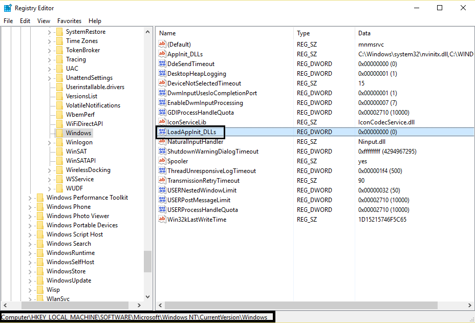 HKEY_LOCAL_MACHINE\SOFTWARE\Microsoft\Windows NT\CurrentVersion \Windows\LoadAppInit_DLLs