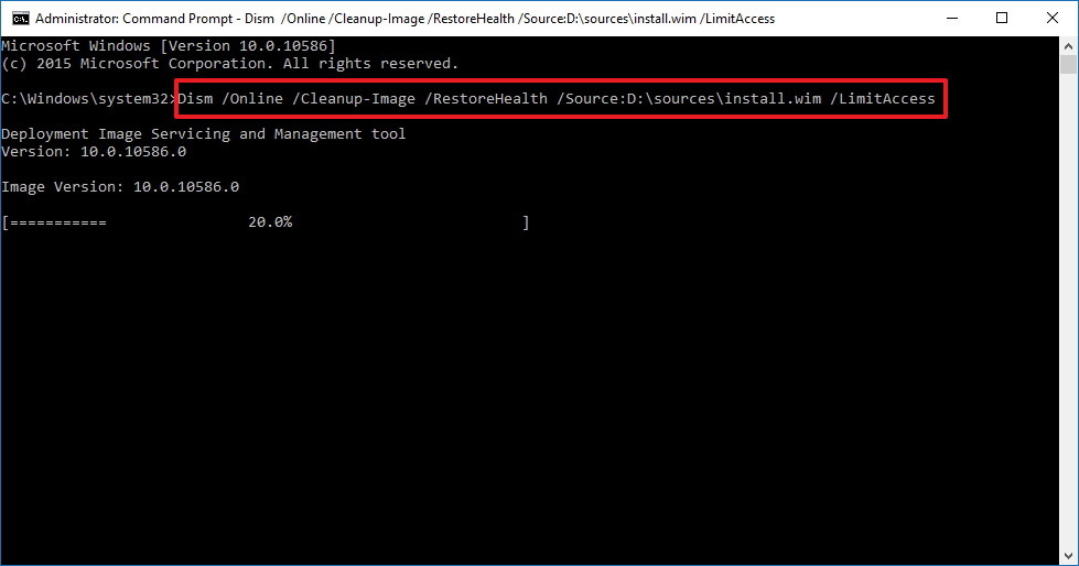 DISM /Online /Cleanup-Image /RestoreHealth /source:WIM:X:\Sources\Install.wim:1 /LimitAccess